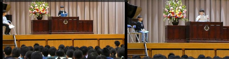 そのあと、始業式です。はじめに意見発表です。今回は、3学期に頑張りたいことを発表した2年生と5年生の