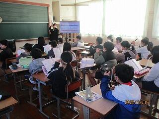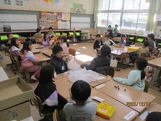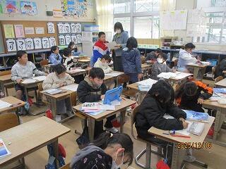 【3年生】1組は算数、分数を使って大きさを表す学習でした。5分の3mは1mを同じ長さで5つに分けたうちの3つ分などを学習していました。2組は学級活動「あったかことばをつかおう」の研究授業でした。自分の考えを発表したりプリントに書いたりしながら、しっかりと考えることができていました。
