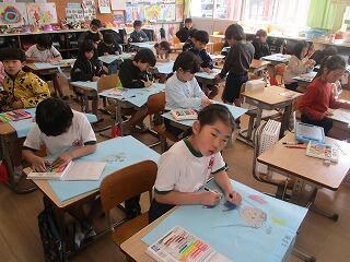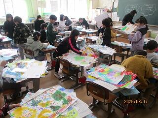 1年生:1組は作品バックの色塗りをしていました。2組は卒業式に向けて飾る絵を6年生との思い出を思い出しながら書いていました。上手に描いていましたよ。