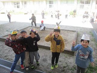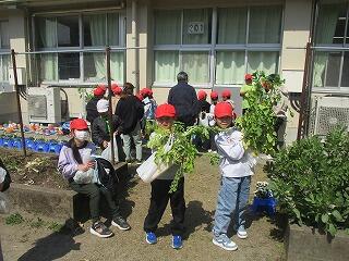 2年生 1組は収穫した野菜を分けて持って帰るため、みんなで話し合ったり、友達の分を取ってあげたりしていました。2組は手作りの帽子をかぶって大はしゃぎ。いろんな工夫を凝らしていてとっても楽しそうでした。