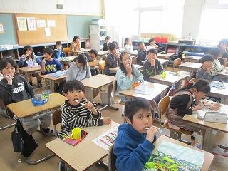 3年生は、1組は給食後の歯磨きの様子です。2組はプリントを使った復習を行っていました。