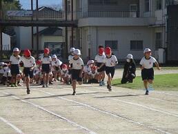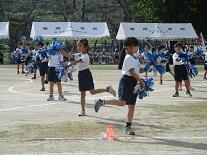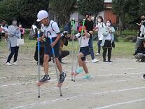 新規採用教員に見せるための模範授業として、中堅教員が5年の体育科ハードル走の授業を行いました。授業では、ハードル間の歩数を動物などの名前を使って、タイミングを合わせる工夫をしました。子どもたちは、歩数とタイミングが合うように熱心に練習を重ねていました。タイミングが合った子は、うれしそうな表情をしていました。