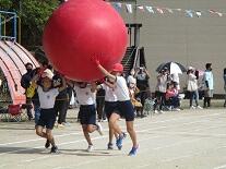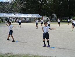4年の体育科の学習「マット運動」の様子です。オジャミを足先に挟んで、背中をマットに付けて足を伸ばして上げ、頭の上の床にオジャミを置く動作をしていました。また、マットの上に軍手を置き、マットの横から軍手に手を着いて、脚を上げてマットを跳び越す動作をしていました。このように体育科では、いろいろな道具を使って、運動の特性を引き出したり、技能を伸ばしたりする工夫をしています。子どもたちは楽しそうに運動に取り組んでいました。