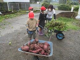 2年生は、生活科の学習で、菜園で栽培した大根を収穫しました。「おでん大根」という味のよい大根だそうです。2年生の子どもたちは、土の中から出てきた白い大根にびっくりしながら掘り出していました。たくさん収穫できて大喜びの様子でした。