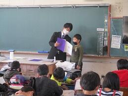 3学期修了の日を迎えました。修了式では、1年生から5年生の学年代表の児童に校長から「修了証書」を手渡しました。その後、各学級では、児童一人一人に学級担任から通知表「あゆみ」が手渡されました。「あゆみ」をもらった児童は、学級担任から、褒める言葉や励ましの言葉をかけられ、とてもうれしそうな表情をしていました。