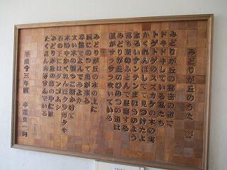 みどりが丘の歌も素敵です。月の歌になっています。今年度は、5月の歌です(*^▽^*)私はまだ、聞いたことがありません(>_<)5月がとても楽しみです。校舎の2階に、卒業生による木彫りの歌詞が掲示してあります。歌詞が何とも言えないいい雰囲気を出しています。