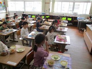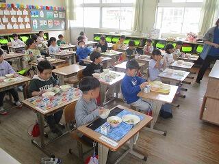 こちらは給食時間。みんなもりもり食べていました。特に6年生の食べる量はすごい!大きくなるに決まっています。