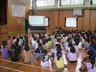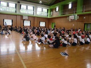 内容はこうでした。誰もいない教室で、明明と点いている電気の写真を見せ、問題提起を行いました。そして、地球温暖化などの環境問題にも話題を広げ、全校児童に節電を訴えたのでした。ナイスプレゼンでした。このように、先月から子どもたち主体の発表などを取り入れた全校朝会になっています。先生たちが話す大切な話をしっかりと聞きながら、自分たちにできることもやってみる。そんなスタンスでいければいいなと思っています。