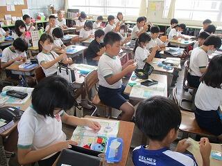 1年生は先生のお手本を見て、七夕飾りを上手に作っていました。