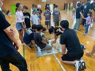 救急救命法の指導を消防士の保護者の方にしていただきました。みんなで人工呼吸の仕方を体験しました。とても貴重な体験となりました。その後の室内ゲーム大会でも班ごとに楽しく活動することができました。頭をけがしてしまった子がいてとても心配しましたが、病院で治療してもらったとのこと、早く全快することを願っています。