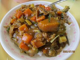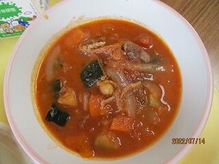 まさに夏野菜のオンパレードでした(*^▽^*)カボチャ、ナス、ゴーヤ、ピーマンなどなど!カボチャは大きく切られて主役とばかりに入っておりました。それよりも存在感があったのはゴーヤです。やはり夏野菜の主役なのですね~。たくさん入っておりました。そしてこの軽い苦みがくせになる感じでした。ニンジンも多く入っていましたが、ニンジンも夏が旬なんですかね~。