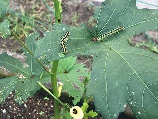 2年生が生活科の学習で植えた、オクラの苗があります。その苗に、毛虫が付いていました(O_O)ネットで調べてみると、オクラの葉っぱによくいる毛虫は「フタトガリコヤガ」と言うそうです。名前の最後からお察しのように、この毛虫は「蛾」の幼虫だそうです。この毛虫は食欲旺盛で、アオイ科の植物を好んで食べます。野菜でいうと、同じアオイ科のオクラが好物なのだそうです。良く食べ、良く大きくなるので、さなぎ手前のものだと体長4センチぐらいまで成長します。良く食べるということは、オクラにフタトガリコヤガがつくと葉っぱがボロボロになることもあるそうです。※最後に毛虫の写真があります。苦手な方は閲覧注意ですよ~<(_ _)>