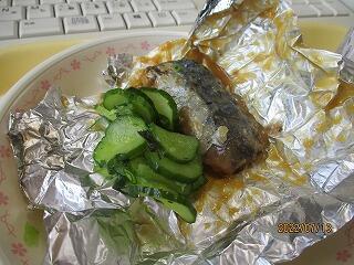 今日の全体像は、こんな感じです。やっぱり、銀色に光るホイルの中身が気になりますよね~(*^▽^*)サバホイル焼きは、ホイルをめくると、みそがたっぷりと塗られたサバの登場です。とってもいいおかずになりましたよ。しその実和えもいい味付けですね~。塩加減も良く、きゅうりの歯応えも良く、大変美味しかったです<(_ _)>魚ソーメンのすまし汁もVERY GOOD!でした。ごちそうさまでした<(_ _)>