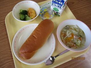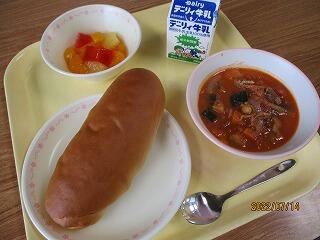 ● 黒糖パン ● 豚肉とズッキーニのトマト煮 ● フルーツポンチ ● 牛乳 でした。