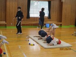 4年の体育科の学習「マット運動」の様子です。オジャミを足先に挟んで、背中をマットに付けて足を伸ばして上げ、頭の上の床にオジャミを置く動作をしていました。また、マットの上に軍手を置き、マットの横から軍手に手を着いて、脚を上げてマットを跳び越す動作をしていました。このように体育科では、いろいろな道具を使って、運動の特性を引き出したり、技能を伸ばしたりする工夫をしています。子どもたちは楽しそうに運動に取り組んでいました。