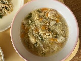 ● ごはん ● かきたま汁 ● いわし梅煮 ● ほうれん草とささみの和え物 ● 豆乳プリン ● 牛乳   でした。