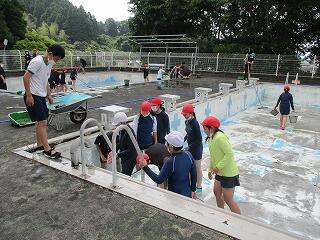 先ずは、プール清掃ですね。今週から水泳の授業が行えるように、先週金曜日(3日)に6年生と父親塾の皆さんが一生懸命に掃除をしてくれました<(_ _)>先生方もご協力ありがとうございました。プールの中からプールサイド、そして、周りの木々の伐採まで、少ない人数でよく頑張ってくれました。感謝・感謝です(*^▽^*)ありがとうございました。<(_ _)>