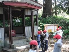 3年生は、社会科の学習で、学校周辺の地域の様子を調べました。この日は、近くにある神社を見学しました。林の中にある神社の様子を見て、気付いたことを熱心に記録していました。