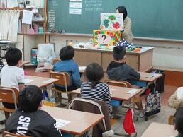 1学年では、中学校所属の栄養教諭による食育の授業を行いました。「野菜のよいところを見つけて仲良くなろう」という学習内容で、子どもたちは、実際の野菜をあてるクイズや野菜が登場人物の紙芝居を通して、野菜の特徴や働きを学びました。子どもたちは、授業を通して食物としての野菜のいろいろな働きを知り、好き嫌いなく食べようという気持ちが高まったようでした。
