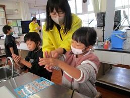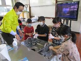 1学年では、都城地区食品衛生協会の方々を講師にして、「手洗い教室」を行いました。1年生は、協会の方から、体によくない細菌やウイルスが手についていると食事の時に口から入るので、手を清潔にすることが大切であることを教わりました。また、手についた汚れが、正しい洗い方できれいに落ちることを実験して確かめました。子どもたちは、正しい手洗いを心がけようという気持ちをもつことができました。協会の皆様、ご指導ありがとうございました。