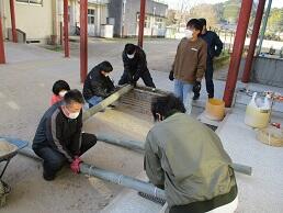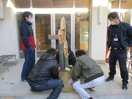 本校の父親塾(親父会)の方々に、児童玄関に飾る門松を作っていただきました。全員で手分けして竹を斜めに切り、高さを整えて3本そろえ、根元にワラを巻いて縛り、飾り付けをしました。手際のよい作業で、短時間のうちにたいへん立派な門松が完成しました。これで来年もよい年が迎えられそうです。父親塾の皆様、ありがとうございました。