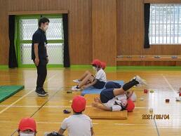 4年の体育科の学習「マット運動」の様子です。オジャミを足先に挟んで、背中をマットに付けて足を伸ばして上げ、頭の上の床にオジャミを置く動作をしていました。また、マットの上に軍手を置き、マットの横から軍手に手を着いて、脚を上げてマットを跳び越す動作をしていました。このように体育科では、いろいろな道具を使って、運動の特性を引き出したり、技能を伸ばしたりする工夫をしています。子どもたちは楽しそうに運動に取り組んでいました。