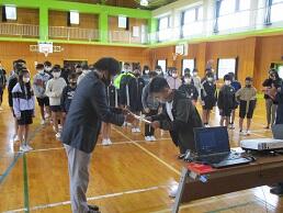 6学年では、都城ブルースカイライオンズクラブの講師を招いて、「薬物乱用防止」の学習を行いました。前半はDVDを視聴し、後半は講師の話を聴きました。6年生は、覚醒剤や大麻などの麻薬の症状や恐ろしさ、一般薬品の乱用、誘惑を断る方法などを学び、学習の最後に「薬物乱用はダメ。ぜったい。」ということを全員で誓いました。