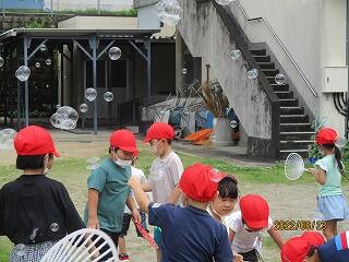 みんな楽しそうでした。どの組のお友達も笑顔いっぱいでした。シャボンのシャワーが運動場に広がりました。とってもきれいでした。そして、いい匂いでした(*^▽^*)遠く、高く飛んでいくシャボン玉や低く、近くに落ちるシャボン玉などなど、1年生が一斉に飛ばしたシャボン玉が勝岡小学校の運動場や校舎の窓、屋上に飛んでいきました。