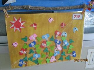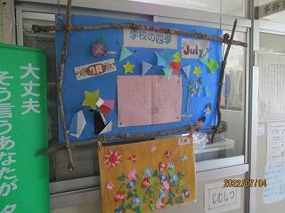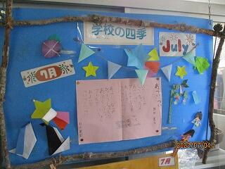 事務室の入口に、子どもの作品を掲示した掲示板があります。この掲示板がすごく素敵なんですよね~(*^▽^*)広報委員会の子どもたちが担当しています。子どもたちが作ったり、視写したりした詩や自分たちで折った折り紙作品が掲示してあります。さらにさらに、その月をイメージした装飾がしてあるんです。4月~6月もそうでした。今回は「7月」です。7月らしさを感じることのできる掲示板が出来上がっています。