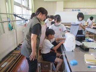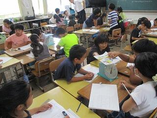 3年生、1組は算数の授業、2組は理科で秤を使って重さを量っていました。理科の教科書の重さはを測って250gとメモリをしっかりよみとっていました。