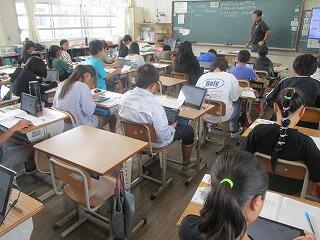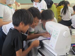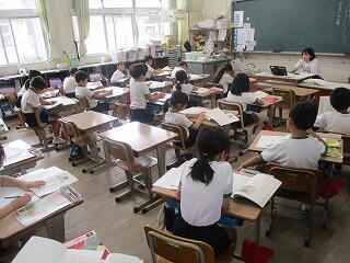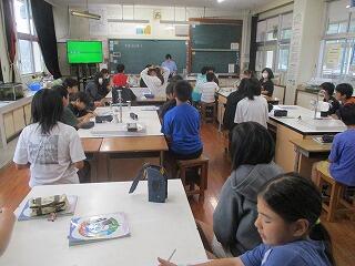 5年生、1組は理科の授業中でした。友だちの発表をしっかり聞いていました。2組は算数の問題を一生懸命解いていました。
