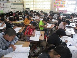 6年生は1組は家庭科、2組は算数に集中して取り組んでいました。算数も内容が難しくなってきていますね。