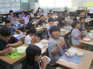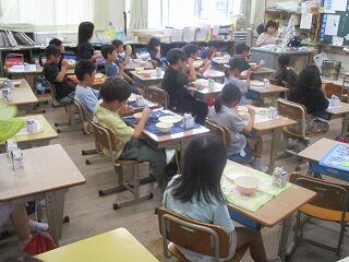1~3年生は給食の時間を撮りました。「おすすめの本」紹介の放送を静かに聞きながら、もりもり食べていました。