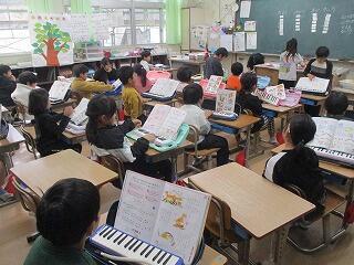 2年生:音楽の授業でした。曲の様子を表している絵はどれかを選んだり、鍵盤ハーモニカを演奏するための階名読みを練習したりしていました。