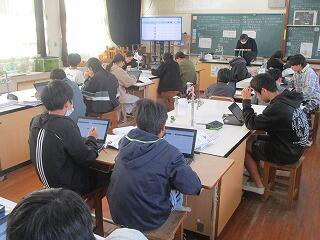 6年生1組は外国語、自分の作ったカードを前で英語で説明する学習でした。みんな上手に説明していました。2組は理科の授業でした。タブレット内の問題に挑戦し、全問正解になると画面に合格が出てくるソフトで復習に取り組んでいました。