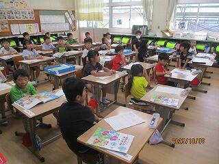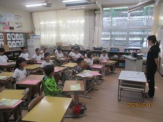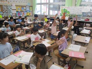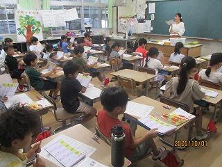 1年生:道徳の授業で主人公の気持ちを考えていました。1組は「あしたは遠足」という題のお話を通して主人公の気持ちを考えていました。2組は「ポンタとカンタ」という物語で学習していました。明日は遠足です。今日学習したことを生かして、安全で楽しく過ごしてほしいと思います。