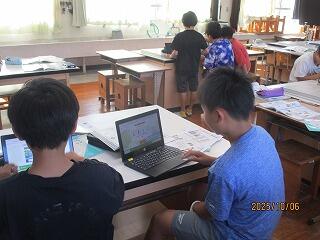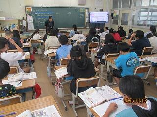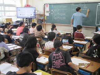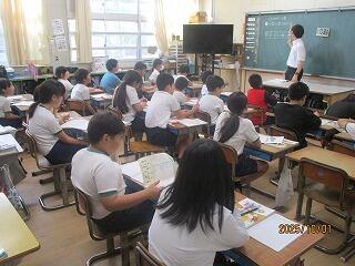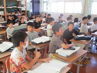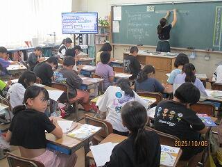 5年生1組は校内のボランティア活動についての話合いを行っていました。少しずつ宿泊学習への心構えを身に付けているところですね。2組は算数。分数を少数で表す方法について考えていました。