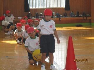 2年生も体育。こちらはボール運動。ボーリングのように転がしたボールを的に入れる競技。見た目より難しいんですよね。