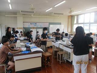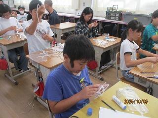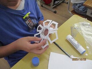 6年生は家庭科でナップザックづくりに挑戦しています。ミシンや手縫いで頑張っていますが、なかなか困難を極めています。図工では細長く切った紙を使って立体を創る創作活動を行っていました。「才能あり」の子がたくさんいました。