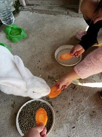 梶山小のアイドル ウサギのぴょん吉に家からえさを5回持ってくると「ぴょん吉と触れ合える券」がもらえます。えさのニンジンをもらって飼育委員会の6年生とドキドキしながらぴょん吉のそばへ。。 ぴょん吉も子どもたちもうれしそうです。
