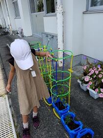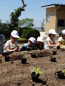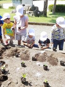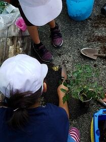 ポットからの出し方や、植え方を先生にならって、「くずれそう!」「折れたらどうしよう!」とドキドキしながら挑戦中の1年生です。
