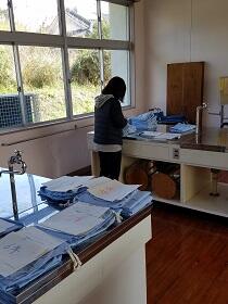 給食着の整理をしているS先生・・昨日、迷いながら3月の献立表を配付しました。3月、また給食を食べられることを祈って。