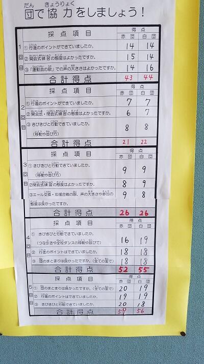 子どもたちのやる気の醸成のための手段の一つとして、運動会の全体練習、予行練習に取り組む姿勢や団のまとまりについて毎回点数をつけています。全ての全体練習が終わった結果です。本番はどうなるでしょうか。勝っても負けてもお互いのがんばりを称え合いたいですね。