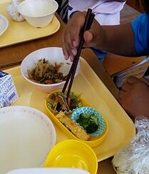 「自分でつくる弁当の日」に向けて給食時間に「ラップでおにぎり」「給食の献立を弁当箱につめる」練習をしました。手際よく、いろどりも考えてお弁当箱に詰めていました。