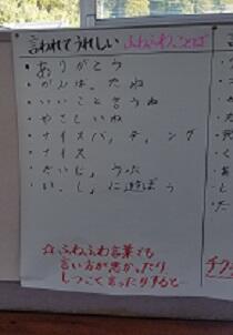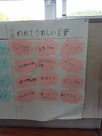 人に言われてうれしい「ふわふわ言葉」言われて悲しい「ちくちく言葉」について各学年で出し合い、話し合いをしました。自分が口にする言葉を、一番最初に誰よりもよく聞いているのは自分です。うれしい気持ちや、楽しい気持ちにさせる言葉を使うと自分自身もうれしい、楽しい気持ちになりますね。