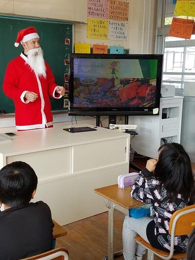ナイジェル先生がサンタクロースに扮して、オーストラリアのクリスマスについてお話をしてくださいました。画面はクリスマスランチ!チキンにデザート、フルーツ・・  「あ!スイカ!Watermelon!」オーストラリアのクリスマスは夏の季節と聞いてびっくりしていた4年生でした。