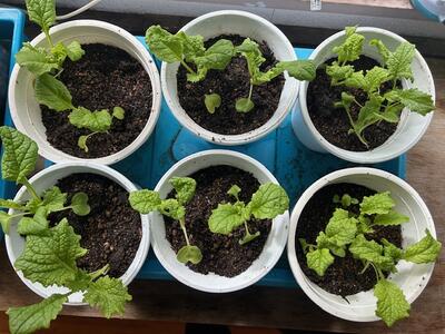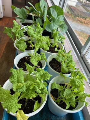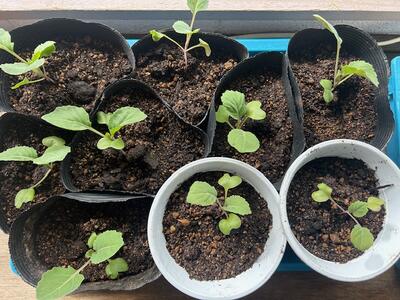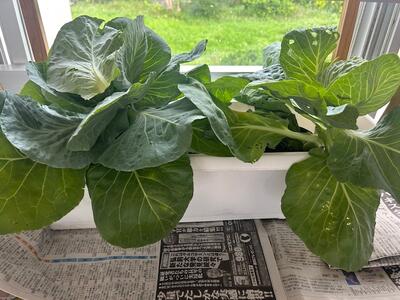 理科室のアブラナ(写真下)とキャベツ(写真上)です。ぐんぐん成長しています。