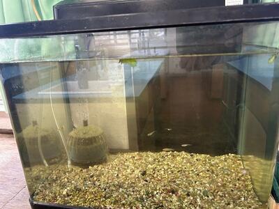 理科室の水槽の水がきれいになっていました。メダカが悠々と泳いでいました。