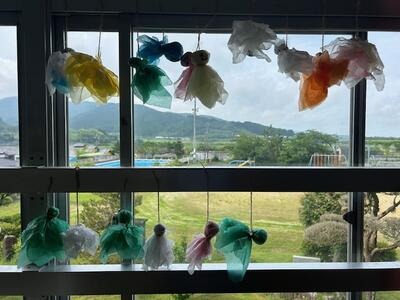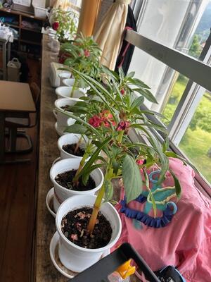 3年生教室の窓側で「ホウセンカ」が育ち、「カラフルなれるてるぼうず」が飾られていました。