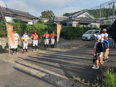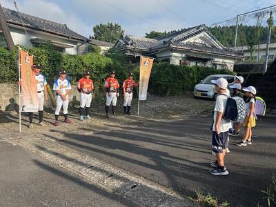 9月12日(金)朝、宮崎サンシャインズの皆さんが、本年度2回目のあいさつ運動をいつもの場所(梶山小校門下:県道33号線)で実施されました。